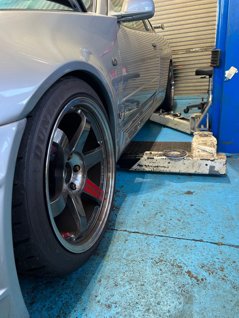 ハブボルトを打ち替えて車高調整、スペーサーをかまして若干のツラ具合に持っていく。