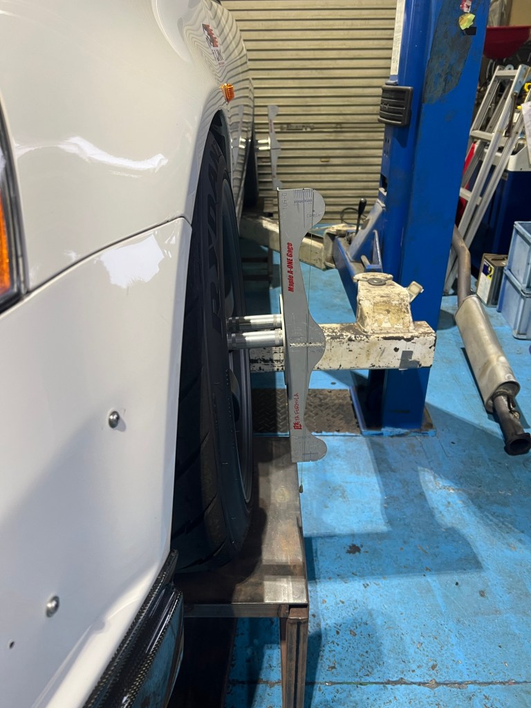まずキッチリ車高を出す、この時にコーナーウエイトゲージを使用して微調整で合わせるのだけれどかなり合わせにくい。
