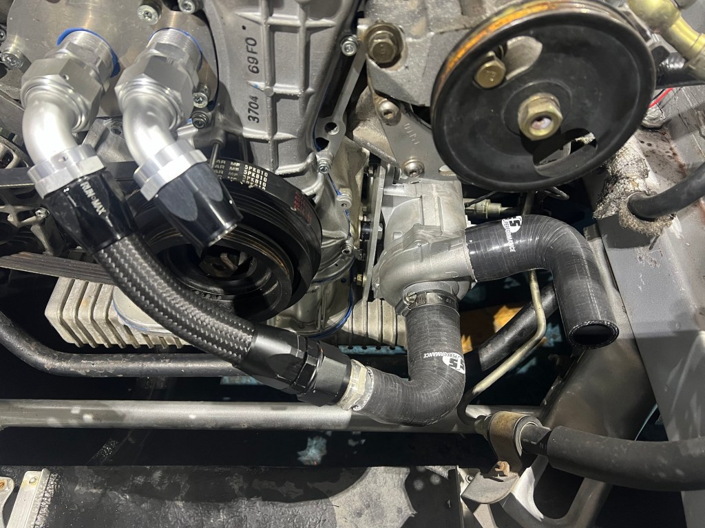 ‘筑波は冷えない’過去の経験からそれは分かっていたので、3.5Lエンジンに使用するCWA200電動ウォーターポンプで強制冷却。