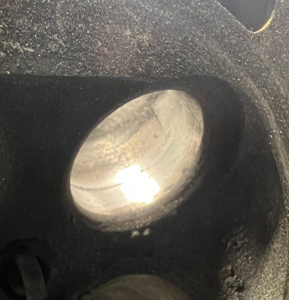 この辺りの年式のエンジンに見られる吸入大で排気小のポート。