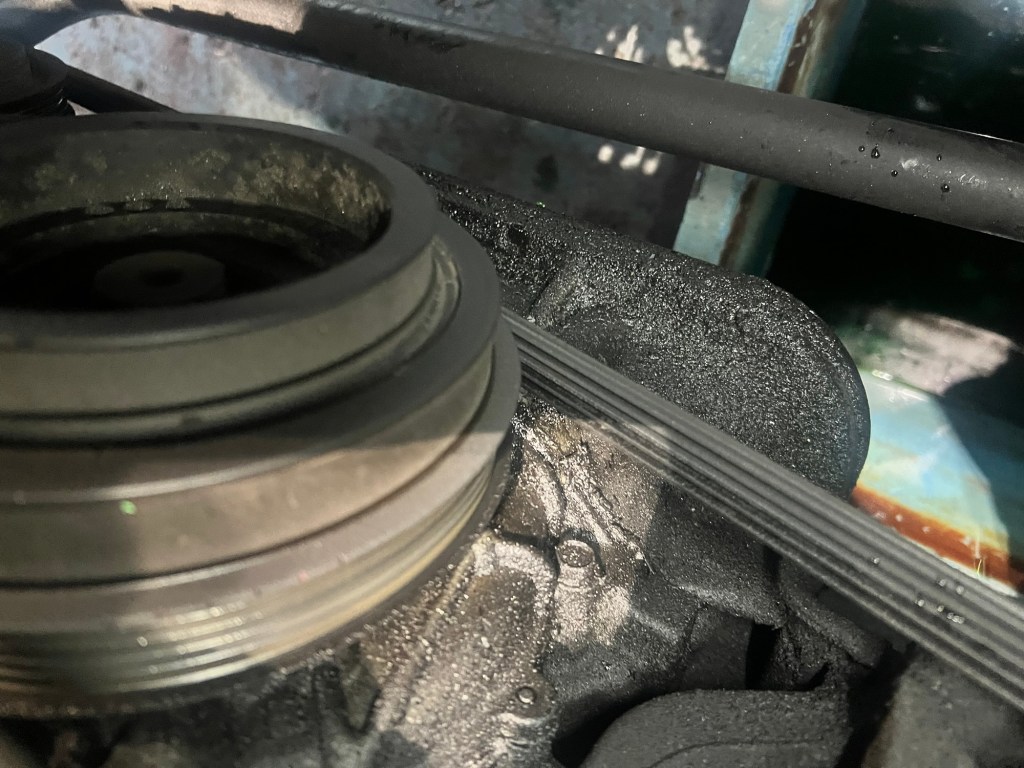 かなり前から漏れているのかフロントカバーだけでなくタービン側やマニの下側まで漏れたオイルが砂を巻き込み固形化。