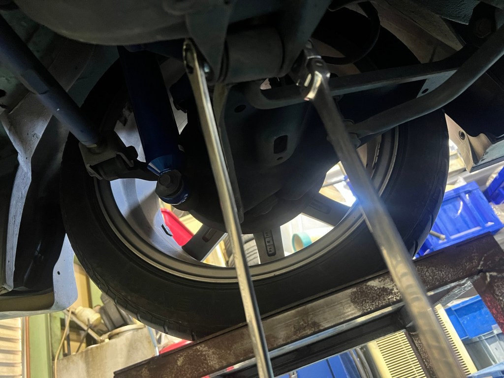 この状態で締め付けてブッシュのねじれを取ることにより、破断だったり変な硬さが出たりするのを処置。